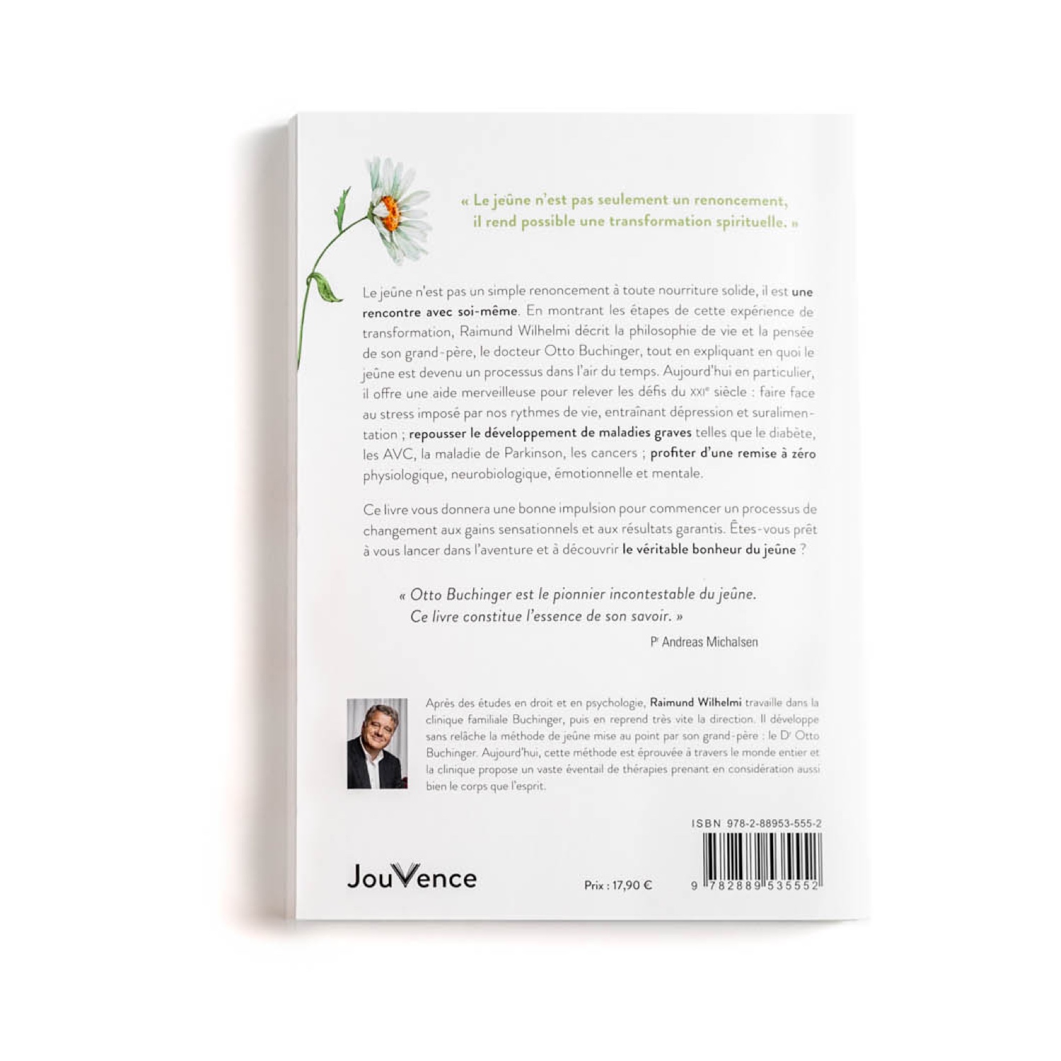 Il y a 100 ans, le docteur Otto Buchinger recevait son premier patient candidat au jeûne et ouvrait à cette occasion une toute nouvelle voie. À cette époque, le jeûne thérapeutique était quasiment inconnu. Depuis un certain temps, cette méthode autrefois marginale bénéficie d’une reconnaissance croissante, y compris auprès de la médecine universitaire. Petit-fils de Otto Buchinger, Raimund Wilhelmi a également consacré sa vie au jeûne thérapeutique et, en tant que directeur de la clinique Buchinger Wilhelmi réputée dans le monde entier, il a accompagné activement durant de nombreuses décennies des personnes souhaitant découvrir cette expérience extraordinaire. Il est plus que jamais convaincu que le fait de renoncer à manger et de jeûner peut entraîner une transformation spirituelle. Le jeûne thérapeutique ne se résume à renoncer à manger de la nourriture solide et à perdre du poids, il permet en réalité une rencontre avec soi-même. Dans ce livre, il revient sur les idées et les origines de son légendaire grand-père et sur le trésor de connaissance et d’expérience qu’il avait pu accumuler. À la question de la signification et de l’avenir du jeûne aujourd’hui, au 21e siècle, il répond avec sagesse, dans une prose charmante et très claire – notamment à travers son expérience personnelle du jeûne sur plusieurs décennies.