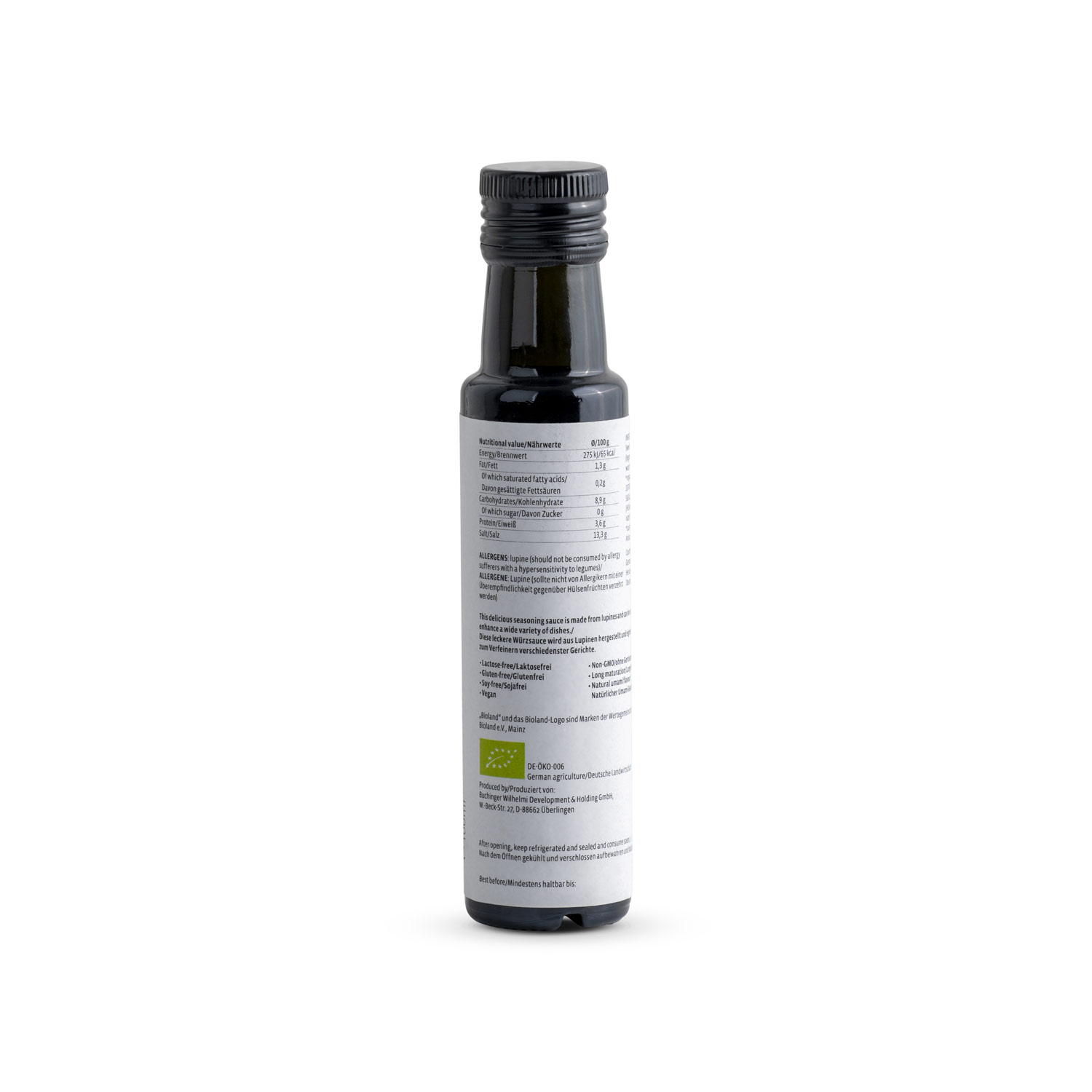 Diese traditionell gebraute, vegane Würzsauce wird mit Süßlupinen und Hafer vom Bodensee angesetzt und darf sich mehrere Monate Zeit zum Reifen nehmen. Die Zutaten stammen aus eigenem Bioland-Anbau und Lupinello ist frei von Farb- und Konservierungsstoffen sowie Geschmacksverstärkern.