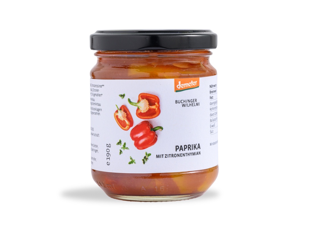 ZUTATEN: Paprika**(48%), Tomatenpüree** (48%), Apfelessig**, Steinsalz, Zitronenthymian*(0,4%), Pfeffer*, Chili gemahlen*