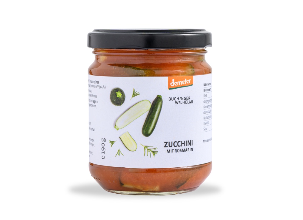 ZUTATEN: Zucchini (49%)**, Tomatenpüree (47%)**, Apfelessig**, Steinsalz, Rosmarin* (0,4%)